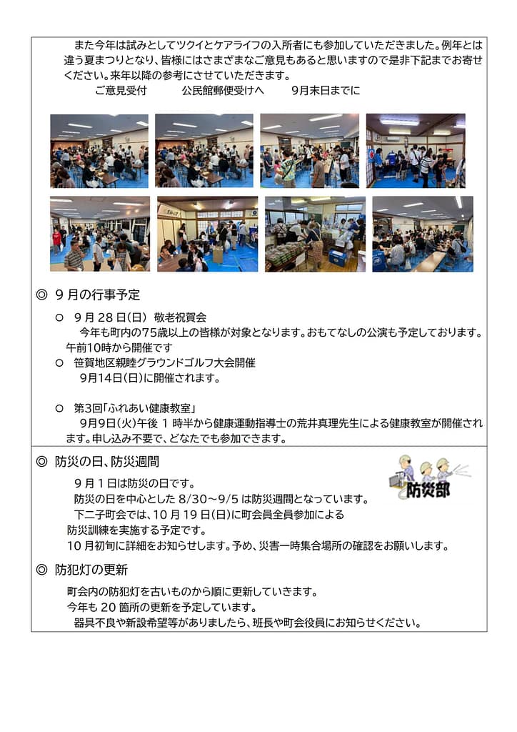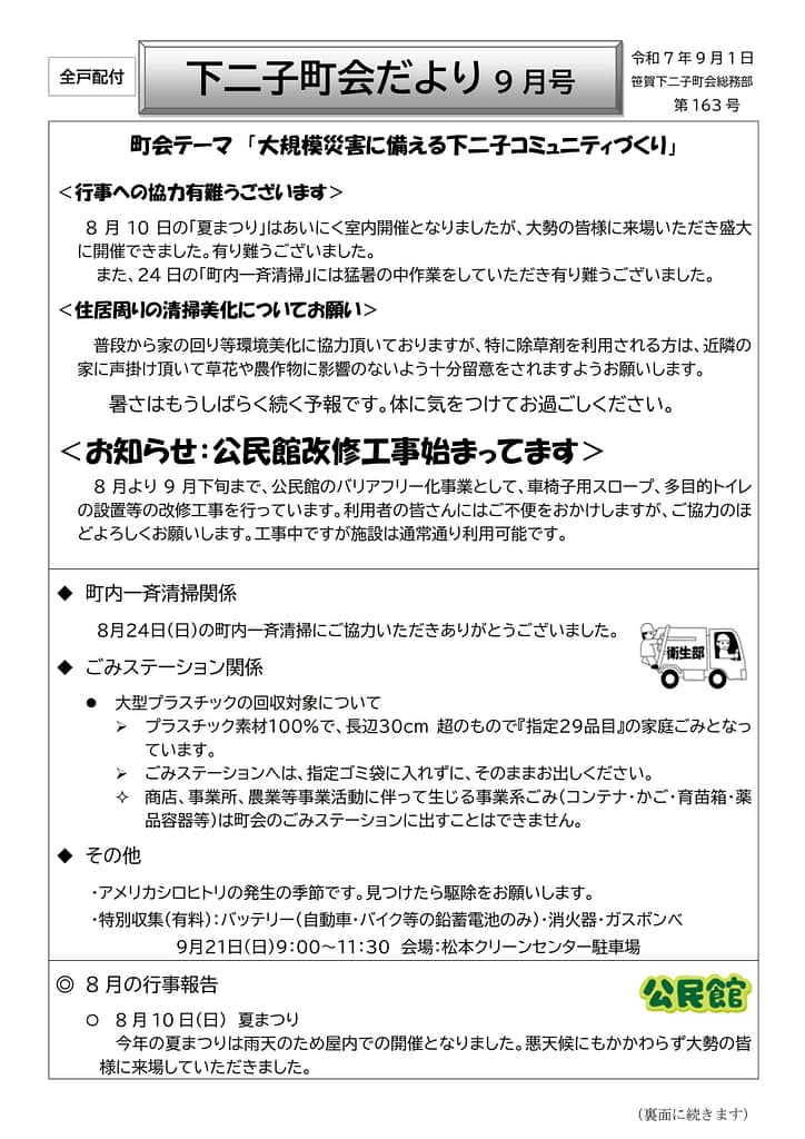 HOME全戸配布 令和7年度下二子町会だより9月号 2025年9月1日2025年9月17日 全戸配布 町会便り PDF版はこちら→163令和7年度下二子町会だより9月号.pdf 令和7年度下二子町会だより8月号 令和7年度防災訓練について